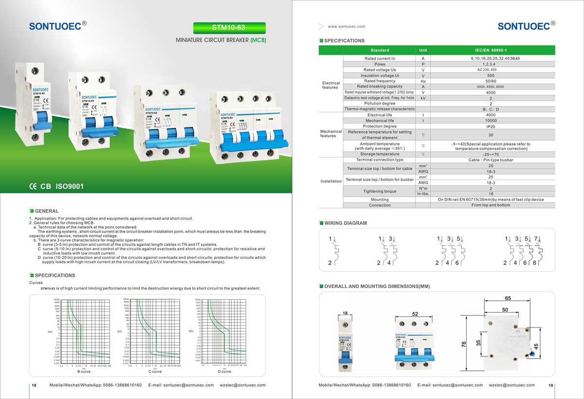 1.過負荷保護:回路内の電流がMCBの定格値を超えると、STM10-63ミニチュアサーキットブレーカーは設定時間内に回路を自動的に遮断し、回路と機器の過熱を防ぎます。